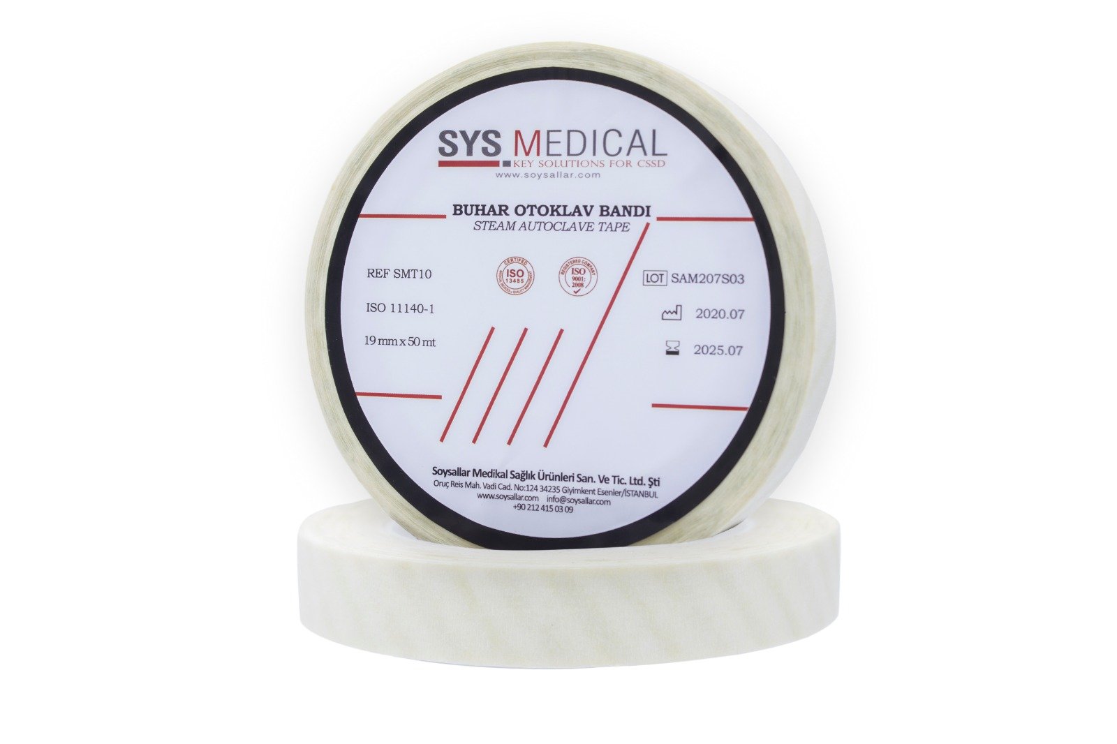 Kendinden yapışkanlı bantlar yüksek teknoloji mürekkeplerle basılmış olup sterilizasyon aşamalarına maruz bırakıldıklarında renk değiştirirler. Sys Medical bantlar buhar,etilen oksit,formaldehit ve hidrojen peroksit plazma sterilizasyon işlemlerin için ayrı ayrı tasarlanmışlardır.